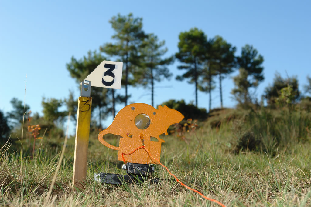 The targets are of the metal knock down variety, originally shaped in the silhouette of animals or now also in basic shapes (e.g. circle, diamond etc). Within the silhouette is a disc, referred to as the “hit zone”. A strike on the hit zone results in the target falling flat and a point is scored. A course normally consists of either 30, 40 or even 50 targets, placed within lanes, normally consisting of two targets to a lane.